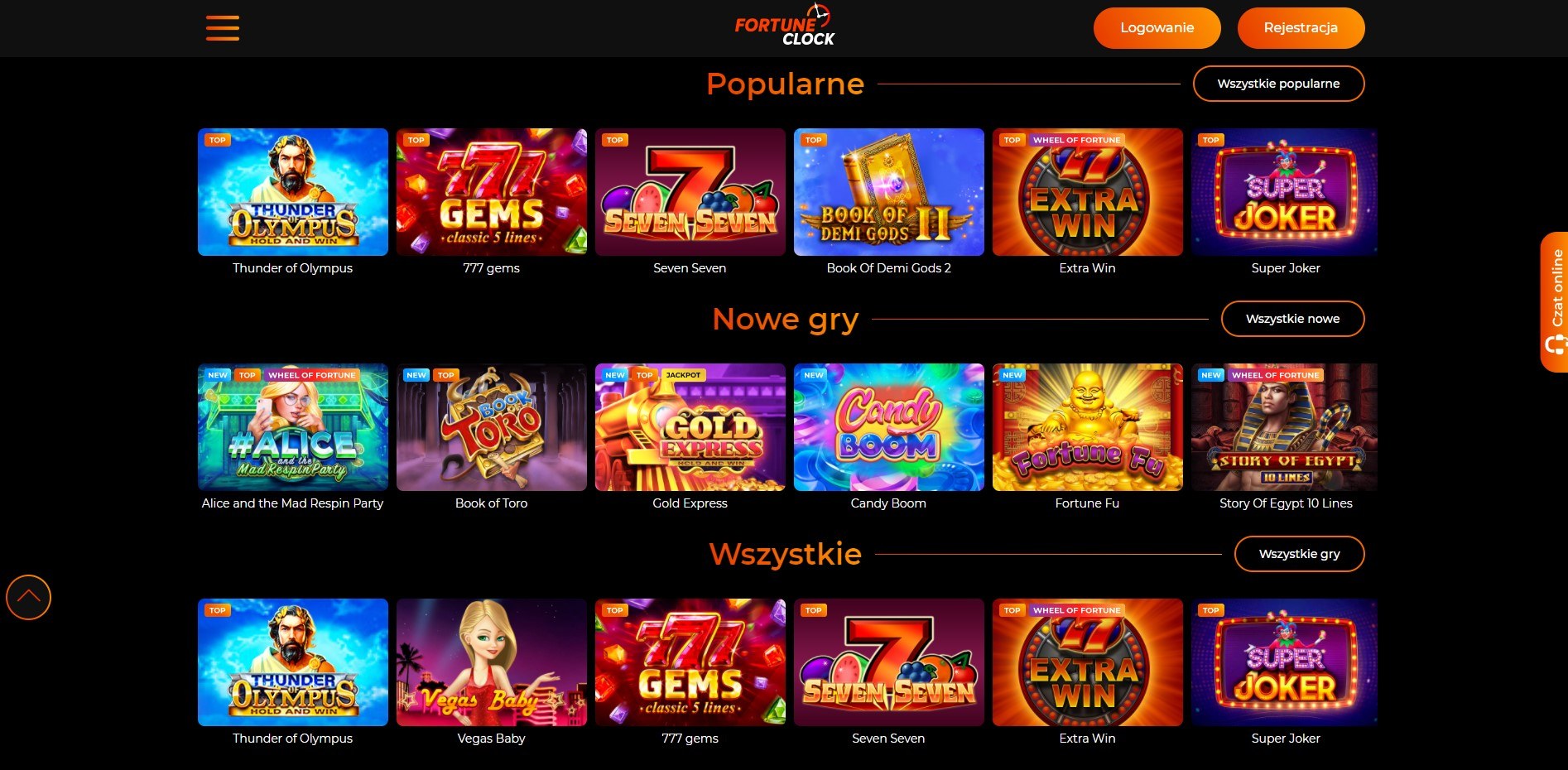 Strona została przystosowana do użytku przez polskojęzycznych graczy, w takich sposób by jak najbardziej ułatwić im poruszanie się po kasynie i korzystanie ze wszystkich dostępnych ofert bonusowych i nie tylko. Fortuneclock.com/pl to oficjalny adres strony internetowej Fortune Clock polskie kasyno online bez depozytu, a odwiedzić je możesz klikając bezpośrednio w przycisk na naszej stronie. Odwiedzając portal Fortune Clock pierwszą rzeczą, na którą z pewnością zwrócisz uwagę będzie ogromna kolekcja gier do wyboru.