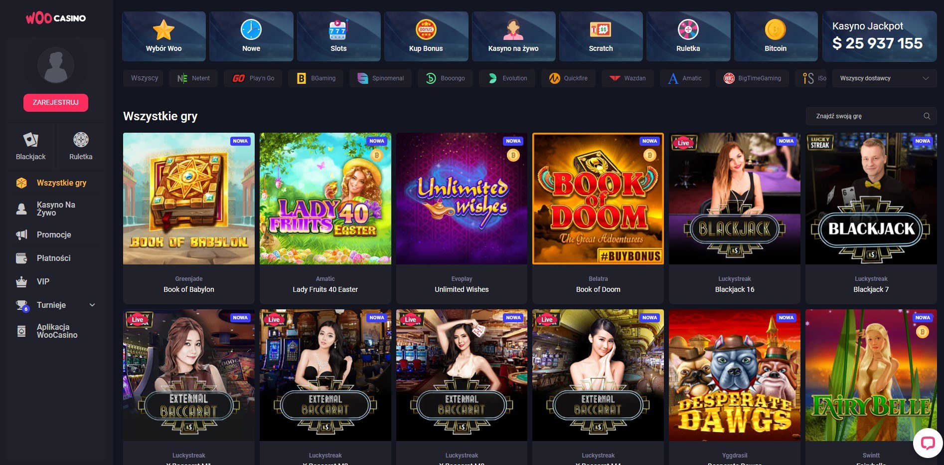 Skoro już zarejestrowaliście konto, to na pewno ciekawi was, jakie w Woo gry kasyno online czekają na odważnych graczy. Przyjrzyjmy się z bliska najpierw samym kategoriom, które widoczne są w górnej części interfejsu: